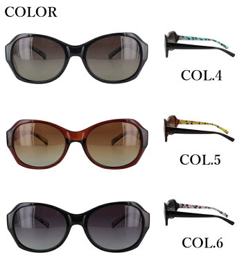 もちろん、有害な紫外線(UV)も99%以上カットします! ●カラー COL4 フレーム:ブラック/ブラック・ボタニカル レンズ:スモークハーフ(トリアセ偏光) COL5 フレーム:ブラウン/ブラウン・ボタニカル レンズ:ブラウンハーフ(トリアセ偏光) COL6 フレーム:ブラック/ブラック・ボタニカル レンズ:パープルハーフ(トリアセ偏光) ●サイズ フレーム幅:(約)140mm フレーム高:(約)49mm 鼻幅:(約)20mm レンズ縦:(約)44mm レンズ横:(約)55mm テンプルの長さ:(約)140mm ●可視光線透過率 COL4 20% COL5 20% COL6 15% ●素材 フレーム:プラスチック(塗装) レンズ:プラスチック(偏光レンズ)(コーティング) 紫外線透過率:1.0%以下(UVカット率99%以上) ●付属品 なし。