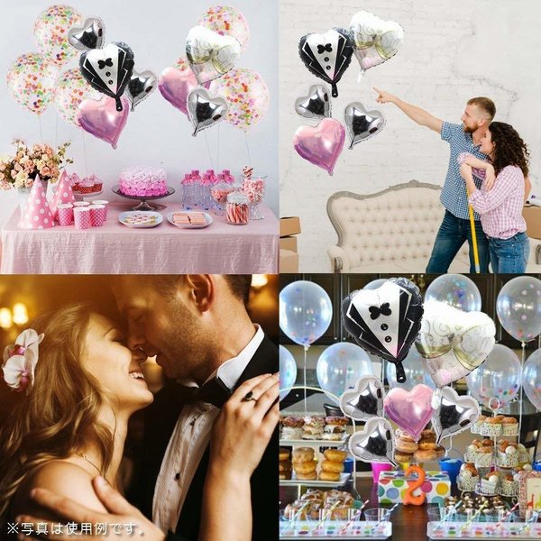 内容:ハート(タキシード)×1個/ハート(ドレス)×1個/ハート(ピンク)2個/ハート(シルバー)1個/ハート(シルバー)2個 サイズ:ハート(タキシード)54cm/ハート(ドレス)54cm/ハート(ピンク)54cm/ハート(シルバー)54cm/ハート(シルバー)30cm 素材:アルミ 海外で大人気のパーティーアイテム。