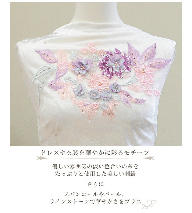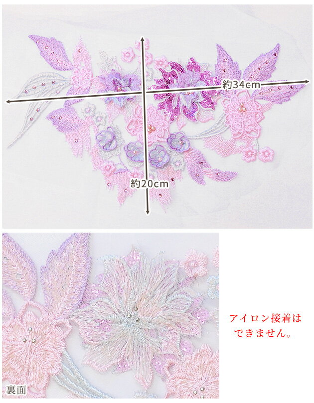 )刺繍スパンコールモチーフ約34cmチュールにピンク、パープル、淡いブルーで刺繍を施し、スパンコールやパール、ラインストーンをあしらったモチーフライトを浴びてキラキラ輝き、立体的なお花モチーフが素敵な華やかで美しいデザインです。