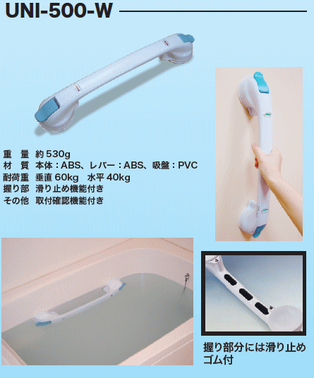 製品仕様 商品名 取り外し簡単!強力吸盤式手すり クイックバー UNI-500-W 内容量 1点 素材・原材料 ○本体、レバー:ABS ○吸盤:PVC サイズ 高さ496mm×幅93mm×奥行87mm 重量 530g 商品説明 ○タイルやユニットバス等硬い平らな面に取り付けられる、強力吸盤タイプの手すりです。